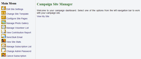 Main MenuAfter signing in to your SiteBuilder account, you will be presented with a main menu of options, similar to the sample menu shown here.