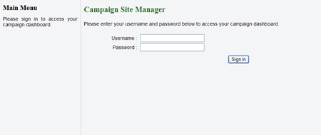 Signing In To Your AccountAfter receiving your username and password, click on the SiteBuilder link and you will see a page similar to that shown at right. This is how you, as the site administrator, will access your site for building and maintaining pages, uploading photos and printing reports. If you have people working for you who will be maintaining your worker lists, event calendars and bulk emails, they will sign in to the back office pages from your website, not here. It is important not to give out the username and password to your SiteBuilder account, as anyone can then sign in and change your site without your knowledge. |