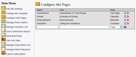 Configure Site PagesThis is where you will probably spend most of your time while designing your site. From this screen you can quickly add, delete and move pages around. Your pages are listed in the order they will appear in your site index, so you will probably want to arrange them in order of importance.